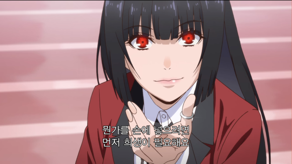 그런데도 왜 인기를 끌었는지는 확실하게 알 수 있었습니다. 이 애니메이션은 전체적인 스토리보다 도박 판 한 번 한 번의 기승전결에 집중을 해서요, 플롯이 비슷해도 사기와 룰이 다르니 흥미로웠고, 캐릭터들 또한 전부 미쳐있되 살육의 천사 때와는 달리 각각 다른 곳에 미쳐있어서(도박에 미친 캐릭터 / 꿈에 미친 캐릭터 / 자학에 미친 캐릭터... 뭐 여러가지) 재미있었습니다.