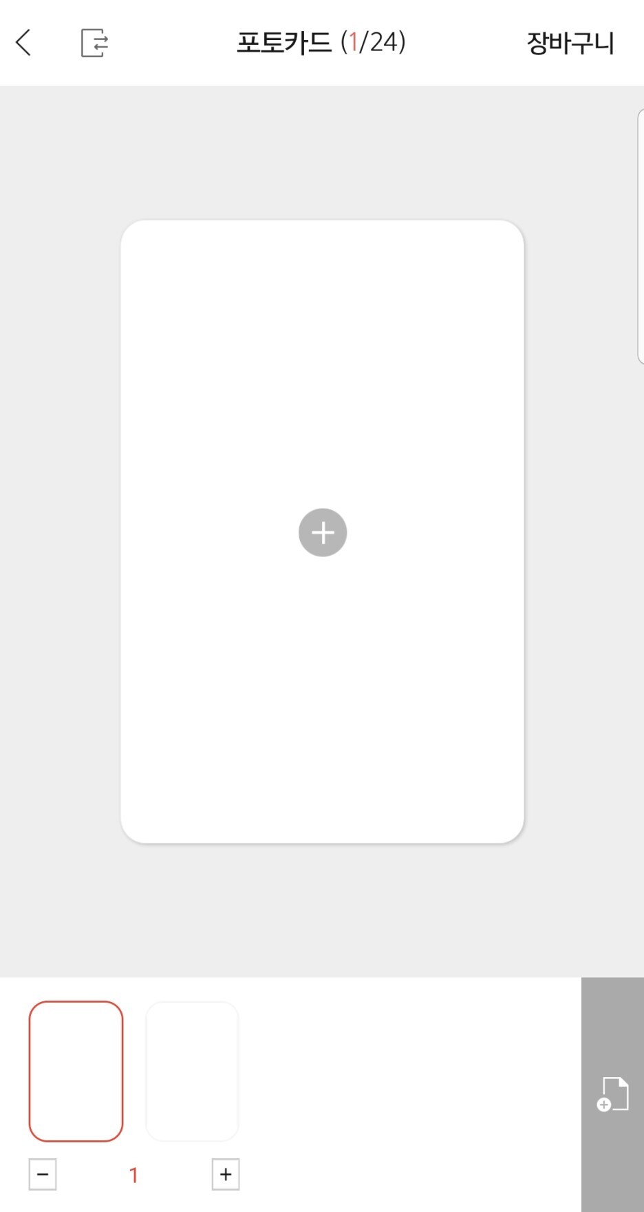 저 - 1 +는 해당 포토카드의 수량을(이를태면 +를 눌러 2를 선택하면, 해당 모양의 포토카드를 2장 인쇄하게 됩니다), 오른쪽의 회색으로 아이콘 표시 된 +는 다른 디자인의 포토카드를 추가하는 버튼이고, 사진은 정 가운데 +를 눌러 편집 가능합니다. 이미 첨부한 경우에도 사진을 누르면 편집 버튼이 뜨므로 잘 조율해보세요!